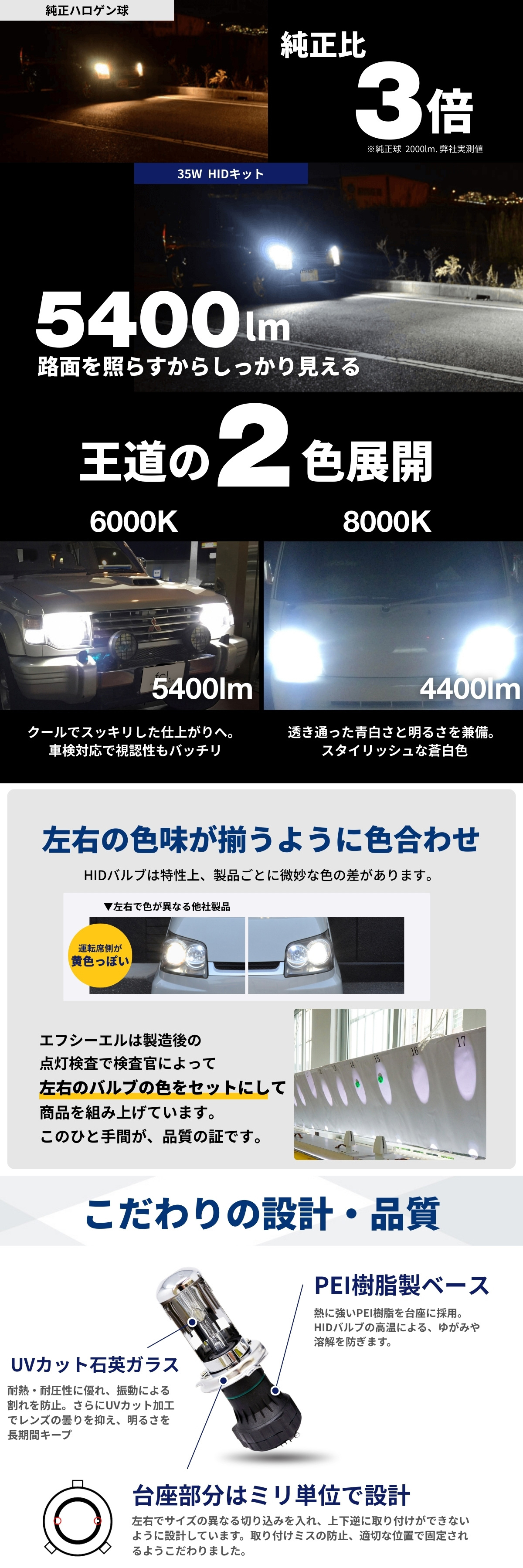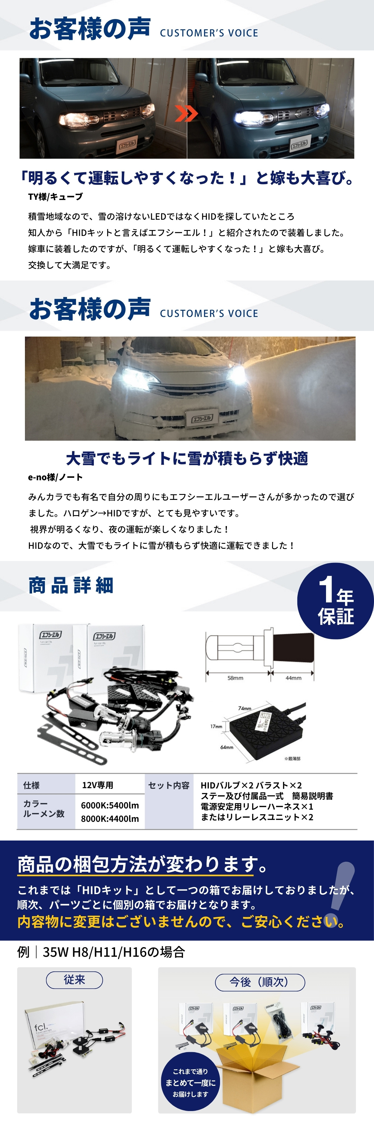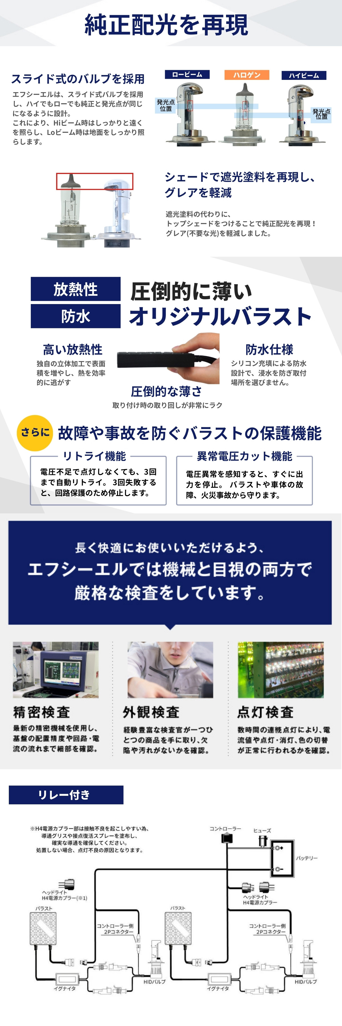 【信頼の品質。車検対応のHIDバルブ&バラスト】 fclブランドが贈る、こだわり設計のHIDキット。左右の色味を揃える点灯検査や、レンズの曇りを防ぐUVカット石英ガラスの採用など、細部まで徹底した品質管理を行っています。付属の極薄バラストは放熱性と防水性に優れ、車両の異常電圧を感知して回路を保護する機能も搭載。複雑な配線加工を必要とせず、取り付けの自由度を高めるステーも付属しています。長く安心してご愛用いただけるよう、機械と目視による厳格な検査をクリアした商品をお届けします。 |