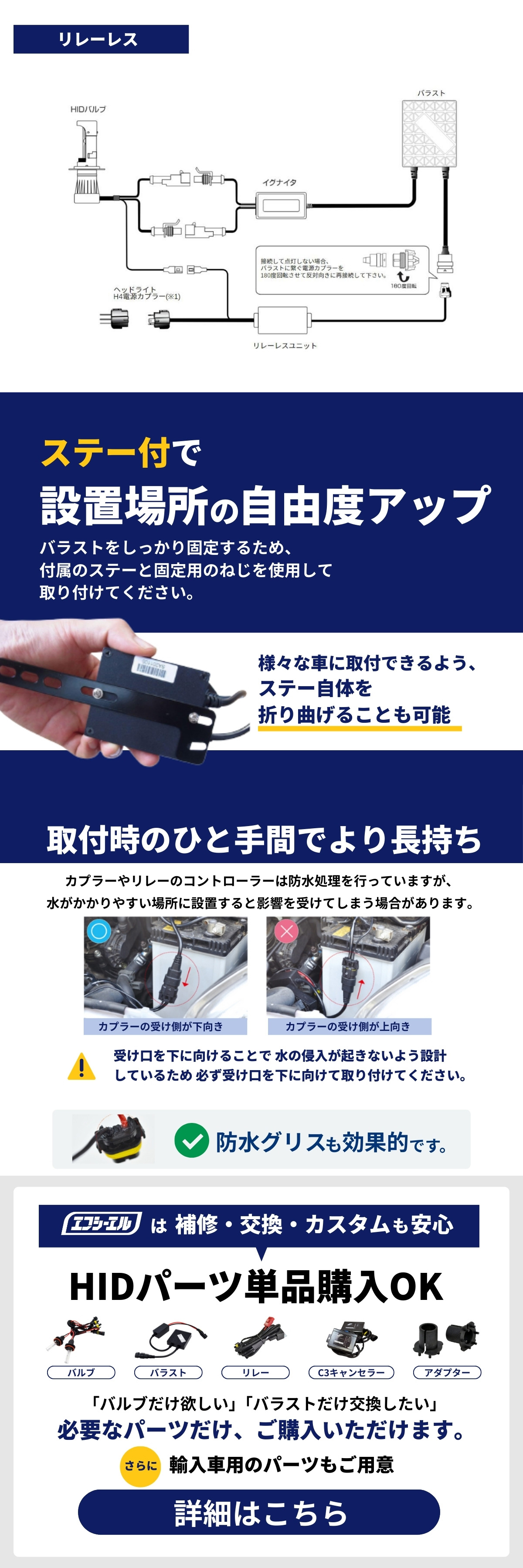 ・24V車は装着不可。 ・ライト交換後は必ず光軸調整を行ってください。 ・一部アイドリングストップ車では、再始動時の電圧変動により一時的にチラつく場合があります。 ・バルブ~バラスト間の配線加工は厳禁です。漏電や不点灯の原因となり大変危険です。 ・ヘッドライト側にシェードがある場合は、HIDバルブ側のトップシェードを外して装着してください。 ・ガラス管を素手で触らないでください(油分による破損防止)。 ・リレー延長加工が必要な場合も保証対象内です。お車に合わせて調整してください。 ・ご購入前に必ず現車のバルブ形状と取付スペースをご確認ください。 ・その他詳細は>ご利用ガイド<をご確認ください。 |